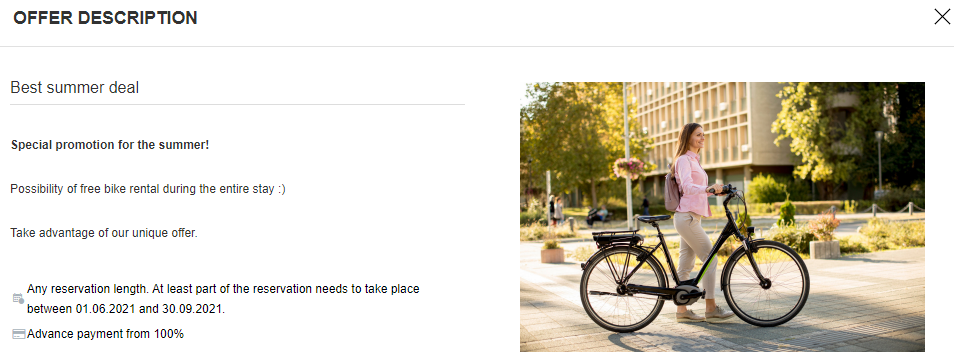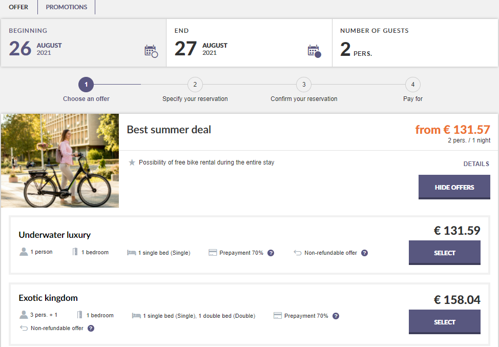 In addition, the entire Promotions tab in Booking Engine has been refreshed to clearly present the accommodations available for booking within a specific bundle. By clicking on the name of the accommodation, the guest will be shown its details.