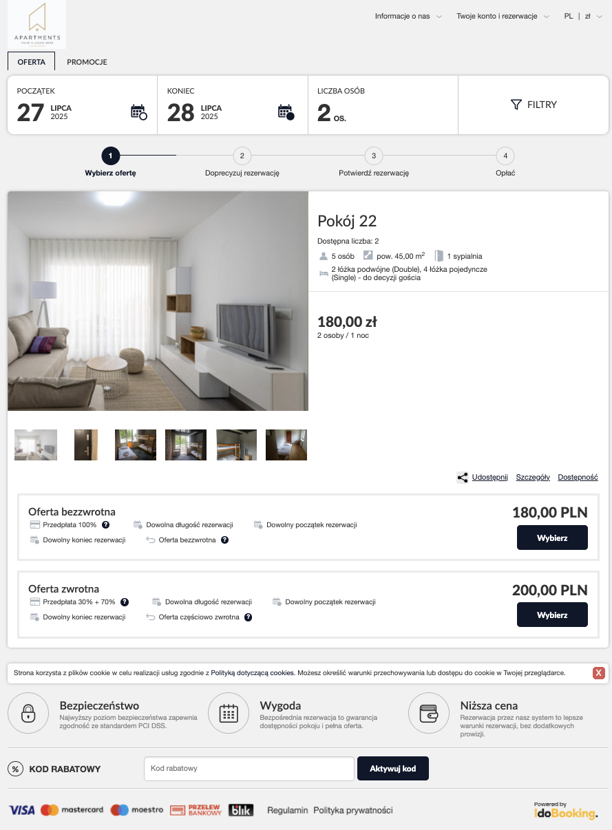 Wszystkie dane przesyłane za pośrednictwem naszego Booking Engine oraz stron internetowych IdoBooking są chronione szyfrowanym połączeniem SSL. To oznacza, że zarówno Twoje dane osobowe, jak i szczegóły płatności są zabezpieczone przed dostępem osób trzecich.