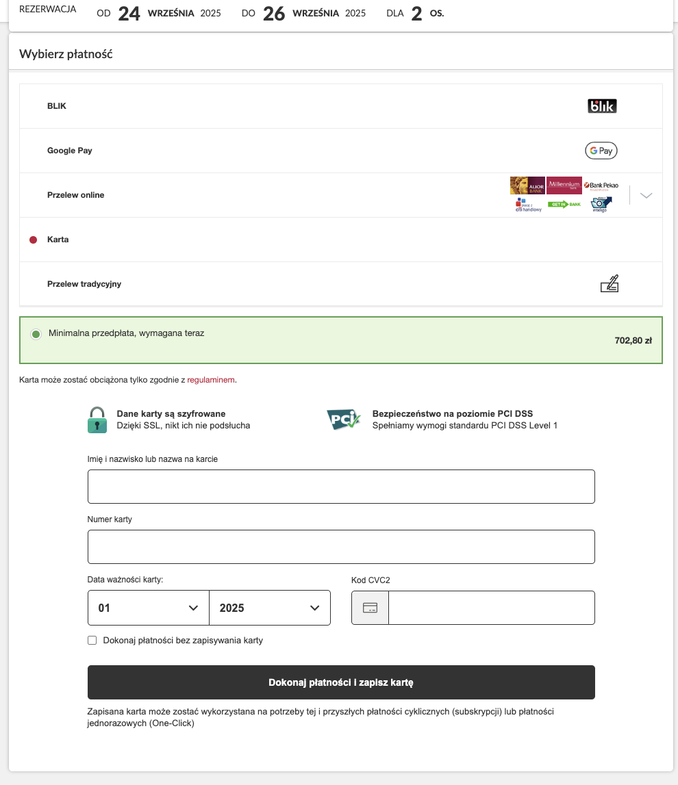 W przypadku rezerwacji wymagających podania danych karty kredytowej IdoBooking stosuje się do norm bezpieczeństwa PCI DSS – międzynarodowego standardu ochrony danych kart płatniczych. Dzięki temu możesz mieć pewność, że Twoje informacje są przechowywane i przetwarzane zgodnie z najwyższymi wymogami.